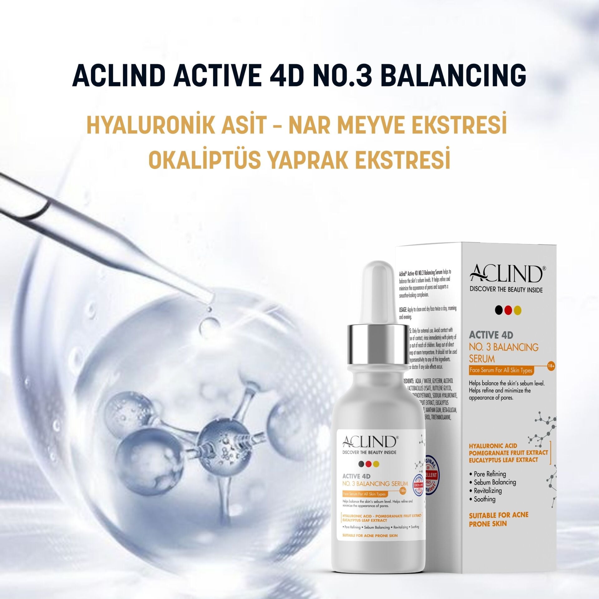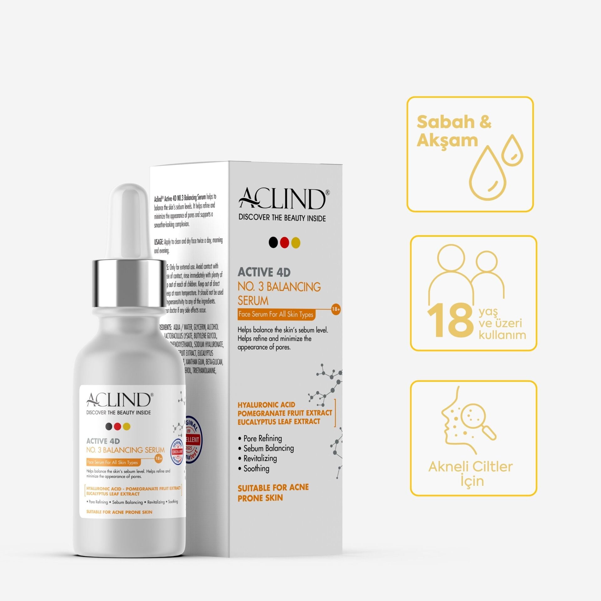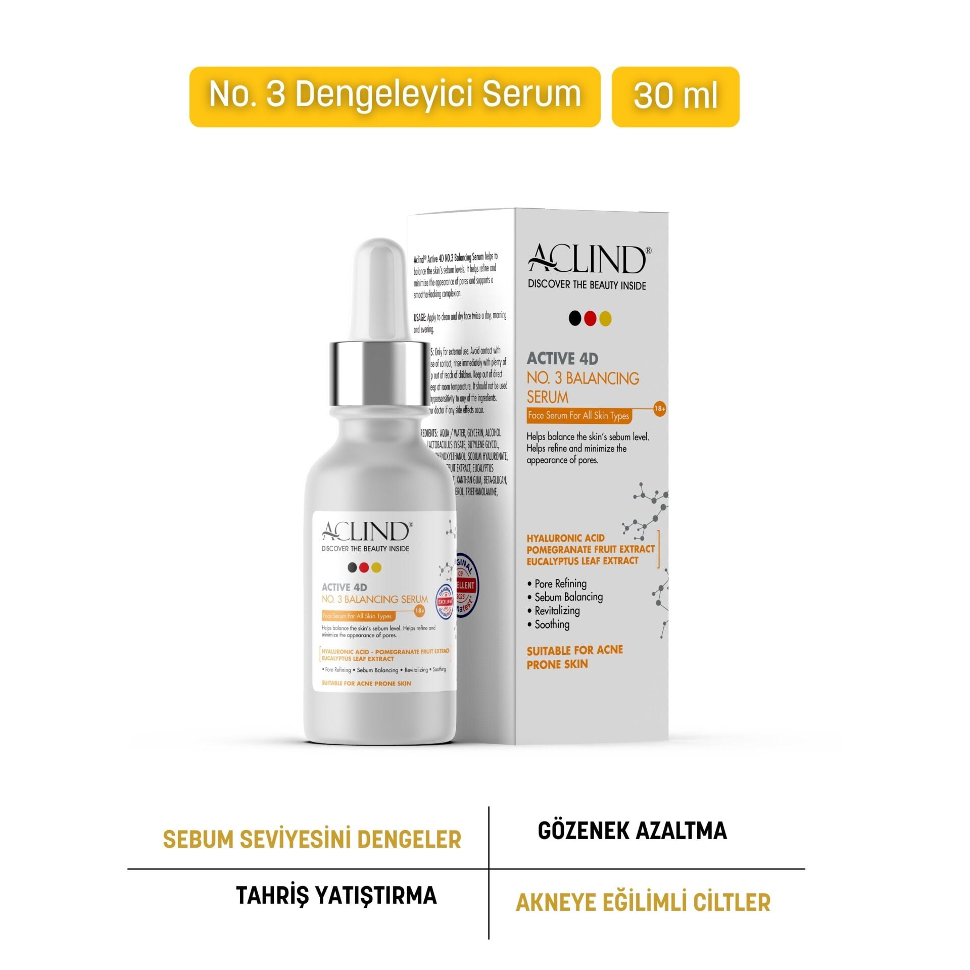 Aclind Active 4D No:3 Gözenek Sıkılaştırıcı ve Sebum Dengeleyici Serum - Akneye Eğilimli Ciltler 30 ml