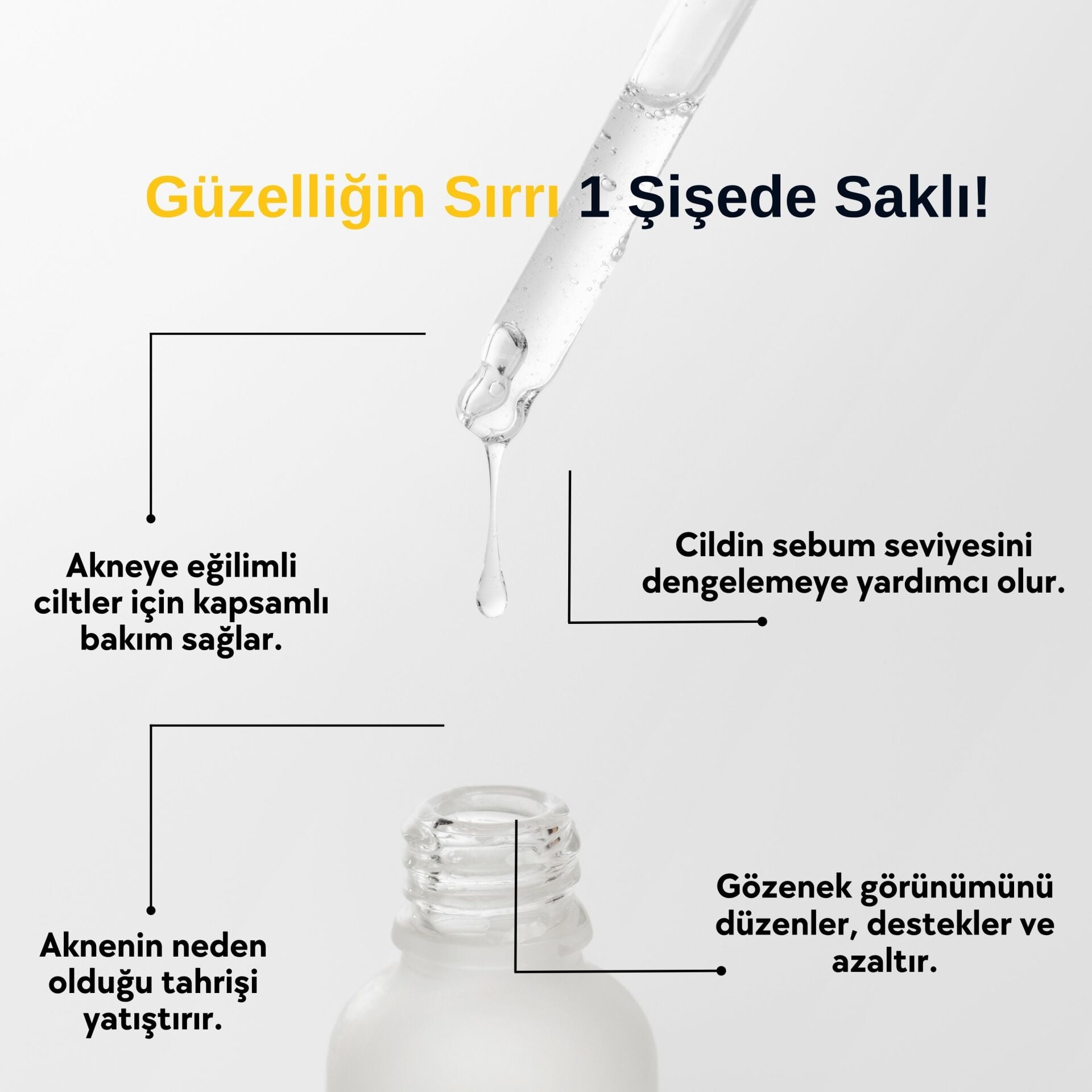 Ciltteki yağ (sebum) üretiminin düzensizliği, parlama ve akneye meyilli bir zemin oluşmasına neden olabilir. Serumumuz, sebum seviyesini optimize ederek: