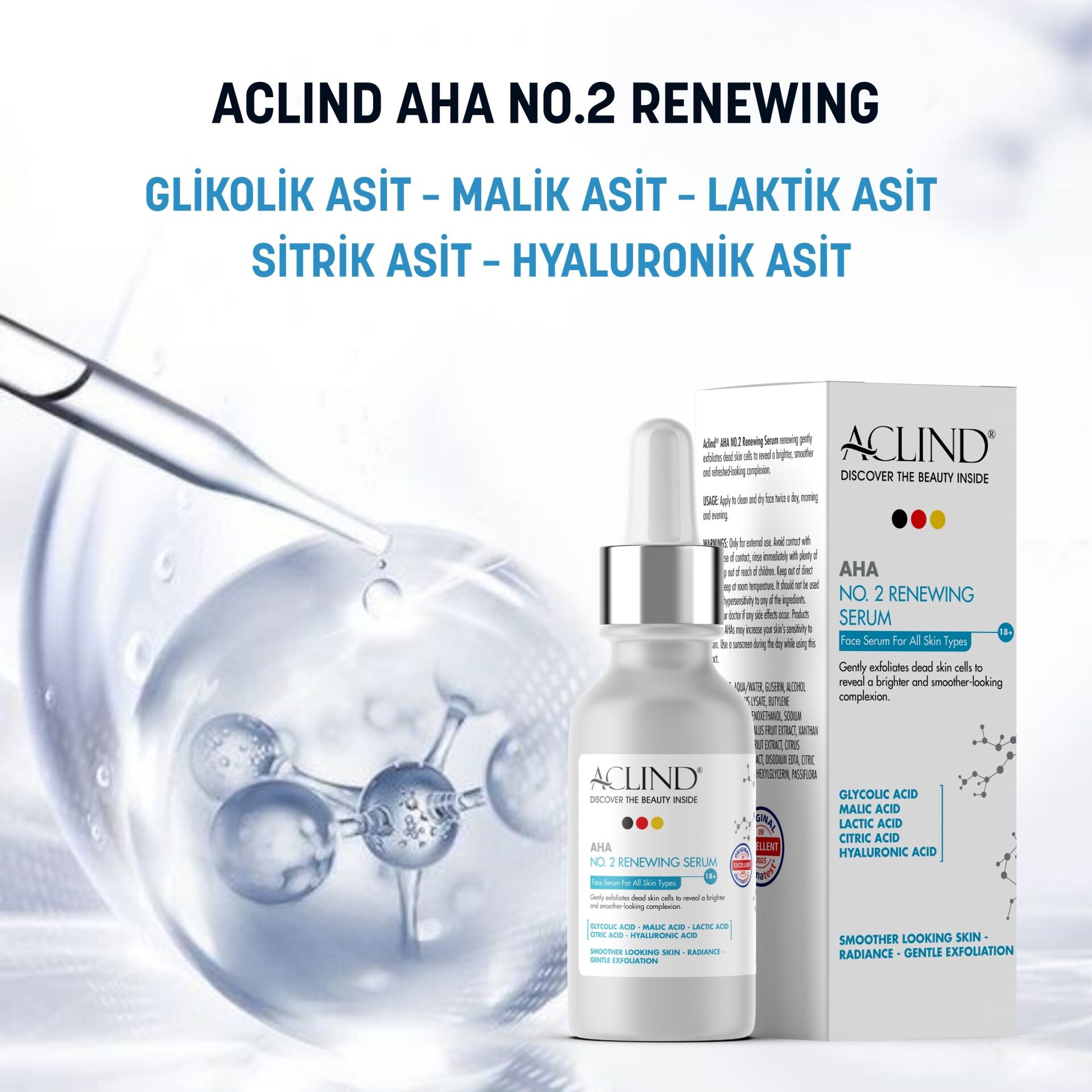 Cildinizin doğal ışıltısını örten ölü hücrelere veda edin. Aclind® AHA No. 2 Renewing Serum, doğadan ilham alan meyve asitleri ve ileri teknoloji bileşenlerle, cildinizi soymadan nazikçe yeniler.