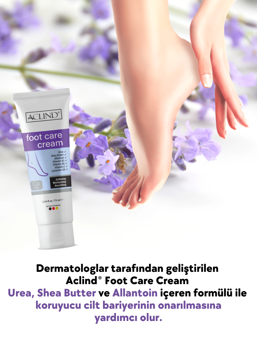 Dermatologlar tarafından geliştirilen Aclind® Foot Care Cream Urea, Shea Butter ve Allantoin içeren formülü ile koruyucu cilt bariyerinin onarılmasına yardımcı olur.