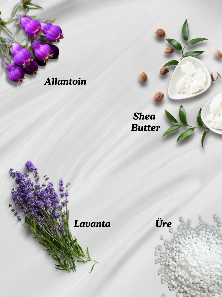 Aqua, Paraffinum Liquidum, Ethylhexyl Palmitate, Urea, Dimethicone, Cetearyl Olivate, Glycerin, Sorbitan Olivate, Glyceryl Stearate, Peg-100 Stearate, Phenoxyethanol, Butyrospermum Parkii Butter, Panthenol, Ceteareth-20, Acrylates/C10-30 Alkyl Acrylate Crosspolymer, Allantoin, Tocopheryl Acetate, Lavandula Angustifolia Herb Oil, Ethylhexylglycerin, Triethanolamine.