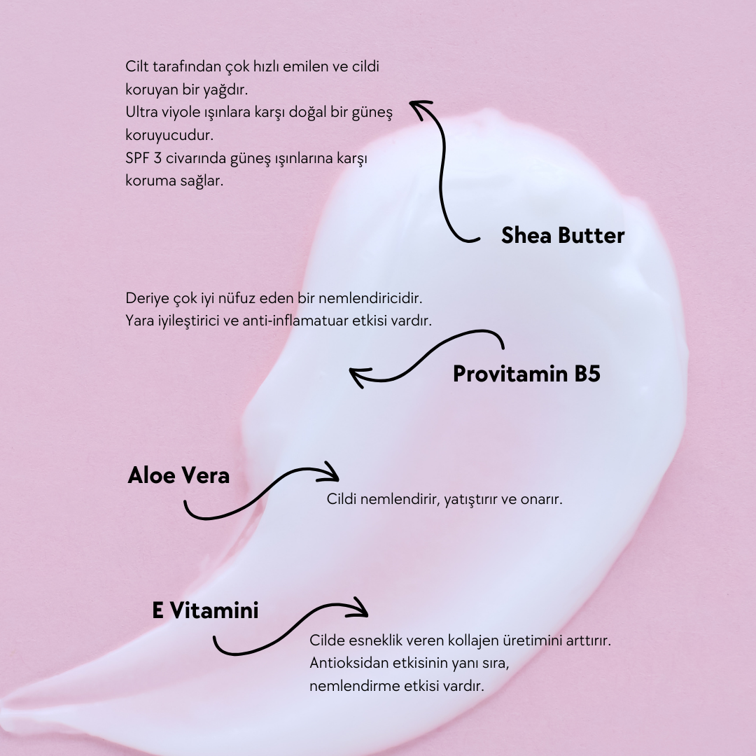 Kullanım Şekli: Günlük kullanıma uygundur. En iyi sonuç için banyo ve el yıkama sonrasında hafif dairesel hareketlerle masaj yaparak uygulayınız.