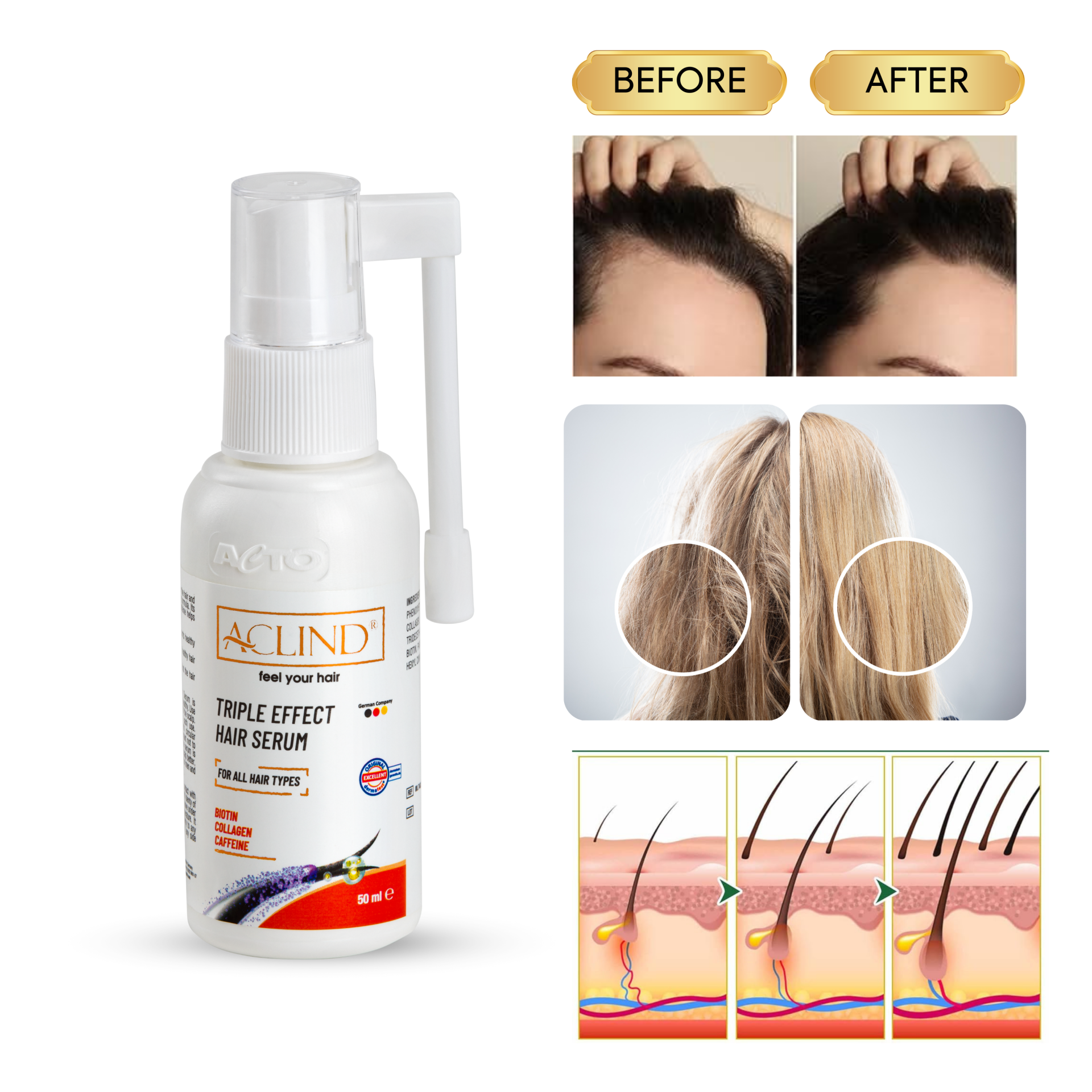 Aclind Tripple Effect Serum / Saç Dökülmesine Karşı Serum• BIOTIN • COLLAGEN • CAFFEINE 50 ml