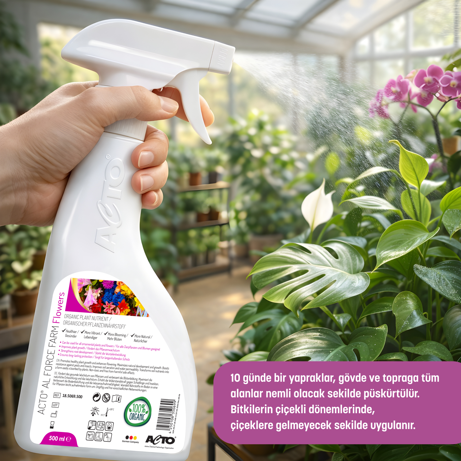 ACTO® AL FORCE FLOWERS 500 ml genel olarak bir sıvı organik gübre ürünüdür — özellikle çiçekli bitkiler ve süs bitkileri için formüle edilmiş organik gübre çeşididir.