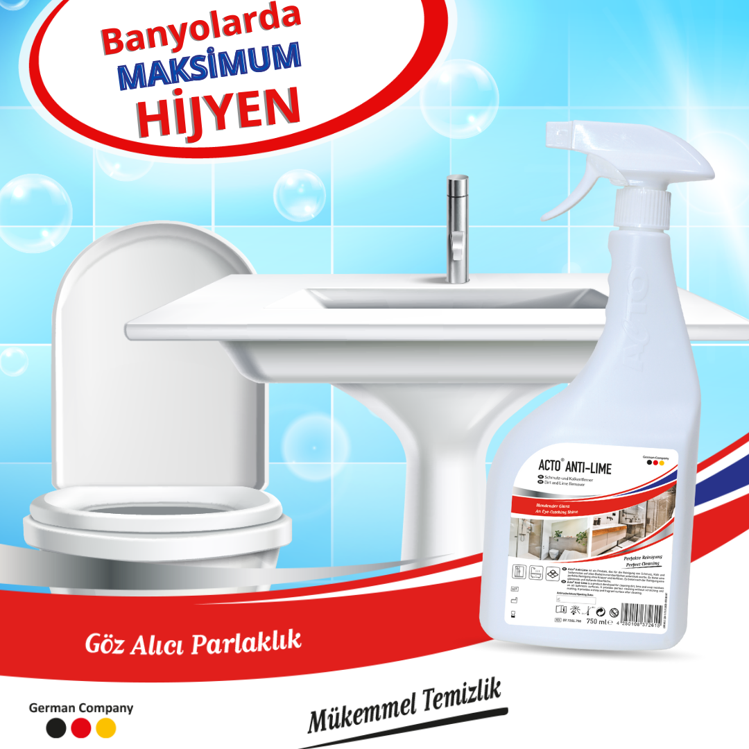 Acto® Anti-Lime tüm banyo yüzeylerindeki kir, kireç ve sabun artıklarının temizlenmesi için geliştirilmiş bir üründür. Çizilme ve matlaşma olmadan mükemmel temizlik sağlar. Temizlendikten sonra parlak ve hoş kokulu bir yüzey sağlar.