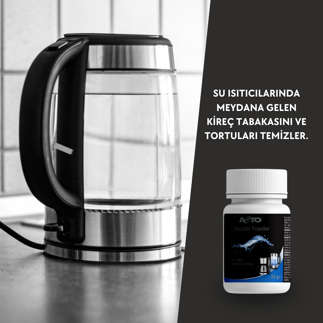 Makine üreticinizin kullanma talimatına uyunuz. Temizlenmesini istediğiniz filtre kahve makinenizin veya su ısıtıcınızın haznesine bir paket Acto® Descaler Powder (25 g) ekleyin. 1 L suyu (1000 ml) Acto® Descaler Powder ’ın üzerine ilave edin. 2-3 dakika Acto® Descaler Powder ve su karışımını makineniz içinde kaynatın (Kirecin tamamen temizlenmemesi durumunda süreyi uzatabilirsiniz.). Ardından kireç birikintilerinin bulunduğu suyu dökün. Bol su ile durulayın.