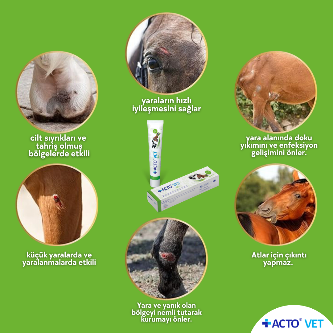 Acto® Vet Gel, tüm türlerde akut, kronik ve enfekte olmuş yaraların nemlendirilmesi, temizlenmesi için kullanılır. İyileşme sürecine yardımcı olur.