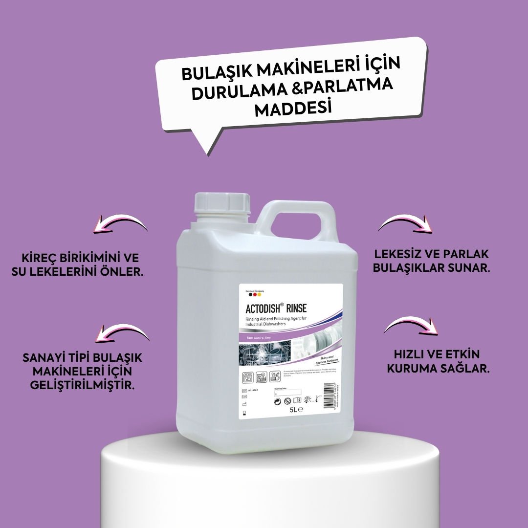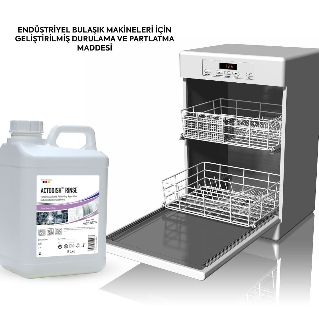 Actodish® Rinse, endüstriyel bulaşık makineleri için geliştirilmiş bir durulama yardımcısıdır. Kireç birikimini ve su lekelerini önler. Lekesiz, parlak ve kuru bulaşıklar sunar.