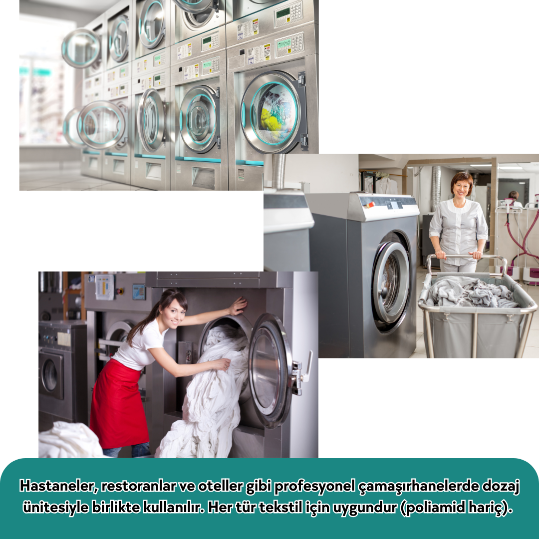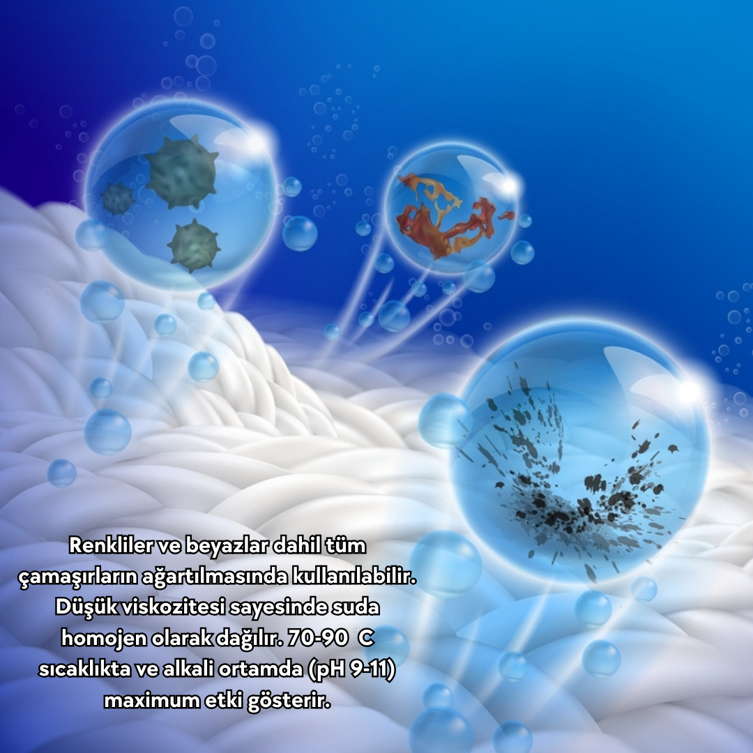Renkliler ve beyazlar dahil tüm çamaşırların ağartılmasında kullanılabilir. Düşük viskozitesi sayesinde suda homojen olarak dağılır. 70-90 0C sıcaklıkta ve alkali ortamda (pH 9-11) maximum etki gösterir.