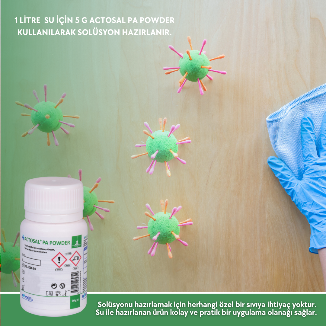 Actosal® PA Powder, aktif oksijen sistemine dayanır. Geniş etki spektrumuna sahiptir. Solüsyonu hazırlamak için herhangi özel bir sıvıya ihtiyaç yoktur. Su ile hazırlanan ürün kolay ve pratik bir uygulama olanağı sağlar. Birleşiminde alkol, kuarterner amonyum bileşimleri, biguanid, aldehid ve fenol bulunmaz. Solüsyon hava/ortam, yer ve yüzey temizliği ve dezenfeksiyonu uygulamalarında tek başına kullanılır. Kullanım dozlarında kullanıcı personele ve kullanılan materyallere olumsuz etkisi görülmez. Solüsyon pembe renklidir. Solüsyonun renginin solması solüsyonun aktifliğinin azaldığını gösterir. Aktiflik göstergesi renk değişimi ile değerlendirilir. Kullanım tavsiyesine göre kullanıldığında kullanıcı personele ve kullanılan materyallere olumsuz etki göstermez. Biyosidal ürün ruhsatına sahiptir.